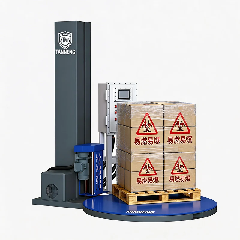 The TANNENG explosion-proof wrapping machine is specially designed for high-risk hazardous environments such as chemicals, coatings, paints, inks, and flammable and explosive dust. It uses an explosion-proof motor, intrinsically safe control system, and full-body anti-static treatment, which can effectively eliminate the risks of electrical sparks, static electricity, and high temperatures, meeting the safety operation requirements of explosion-proof areas. The equipment has a high degree of automation, supporting automatic film feeding, wrapping, film cutting, and photoelectric height measurement. It allows flexible adjustment of the number of wrapping layers, film roll tension, and packaging speed. It operates stably and reliably, significantly improving pallet cargo wrapping efficiency while ensuring cargo is securely fastened and moisture-proof. It is an ideal safety device for the storage and logistics packaging of hazardous chemicals and flammable and explosive materials.